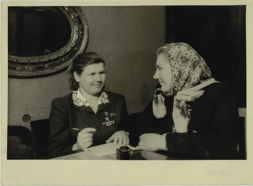 Доярки У.Д. Мосийчук и М.Х. Савченко подписывают договор на соцсоревнование.