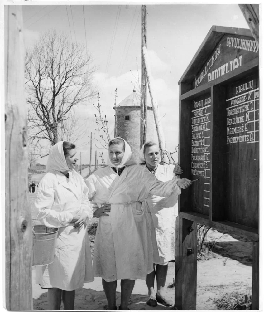 Передовые доярки знакомятся с показателями работы животноводов и полеводов. Литовская ССР