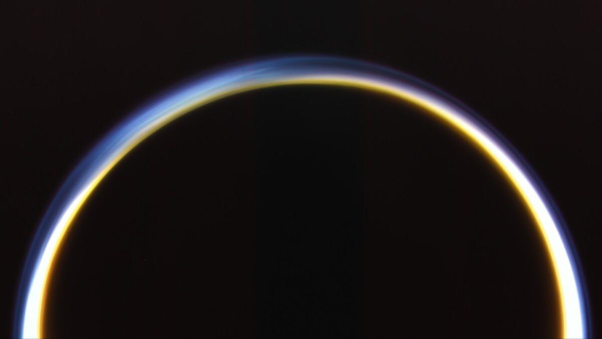 Изображение было получено 26 октября 2004 года космическим аппаратом NASA "Кассини" во время первого близкого пролета мимо Титана. На снимке отчетливо видны высотные слои атмосферной дымки и облака, подсвечиваемые Солнцем.