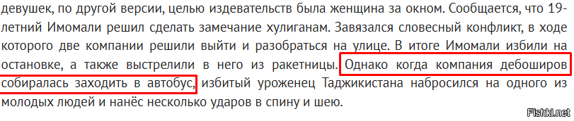 Ты в курсе, что точик после конфликта пошел домой, переоделся, взял ножик и позвал "братьев" в помощь и пошел их выслеживать специально чтобы зарезать?