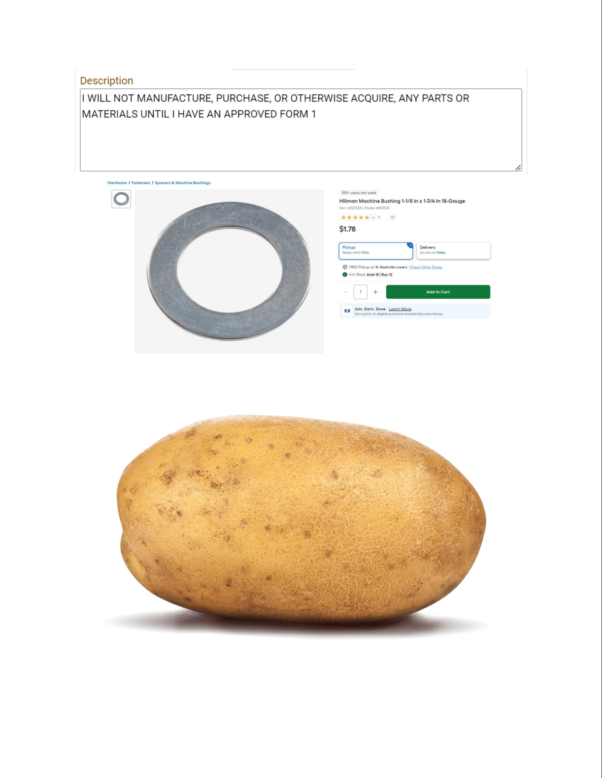 «На данный момент у меня есть серийно пронумерованная шайба, и у меня есть картофель, но я их ещё не собрал вместе. После одобрения существует своего рода производственная пауза — нужно подождать. Плюс возникает целый философский вопрос о намерении изготовления: считается ли началом производства момент, когда ты покупаешь картофель? Или когда в доме вообще есть картофель? А любые картофельные продукты считаются?» — пошутил Кларк.