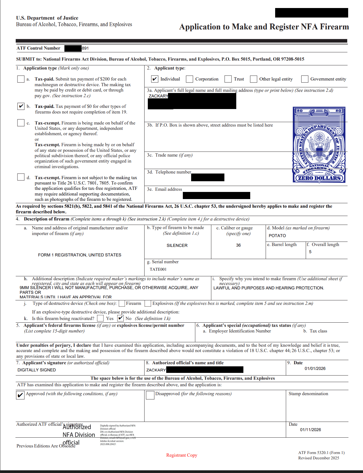 Получив такой подарок, американские кулибины и владельцы 3D-принтеров завалили Бюро по контролю за алкоголем, табаком, огнестрельным оружием и взрывчатыми веществами (ATF) своими странными изобретениями. Одним из таких шутников стал Зак Кларк. Он не первый, кто пытался зарегистрировать картофелину в качестве 9мм глушителя, но стал первым, чьё «изобретение» было одобрено ATF.