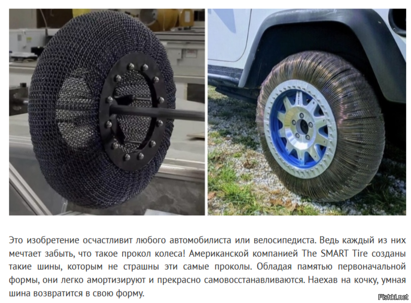 Это изобретение осчастливит любого автомобилиста или велосипедиста. Ведь каждый из них мечтает забыть, что такое прокол колеса! Американской компанией The SMART Tire созданы такие шины, которым не страшны эти самые проколы. Обладая памятью первоначальной формы, они легко амортизируют и прекрасно самовосстанавливаются. Наехав на кочку, умная шина возвратится в свою форму.
