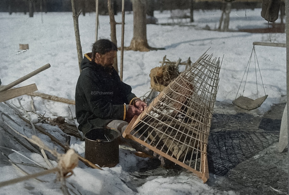 Рыбак за плетением рыбной ловушки гимги (морды), 1914 год.