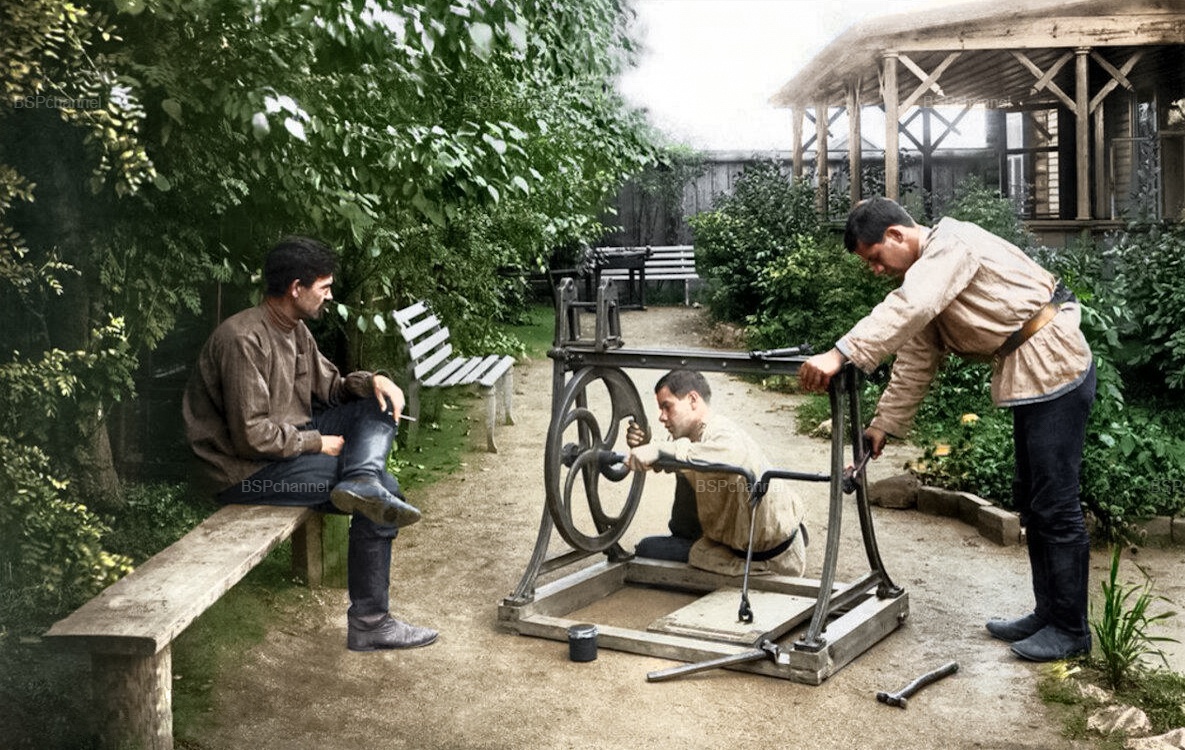Константин Теплоухов с сыновьями Александром (слева) и Владимиром (справа) собирают токарный станок. Оренбургская губ., Челябинский у., г. Челябинск, 1909 год.