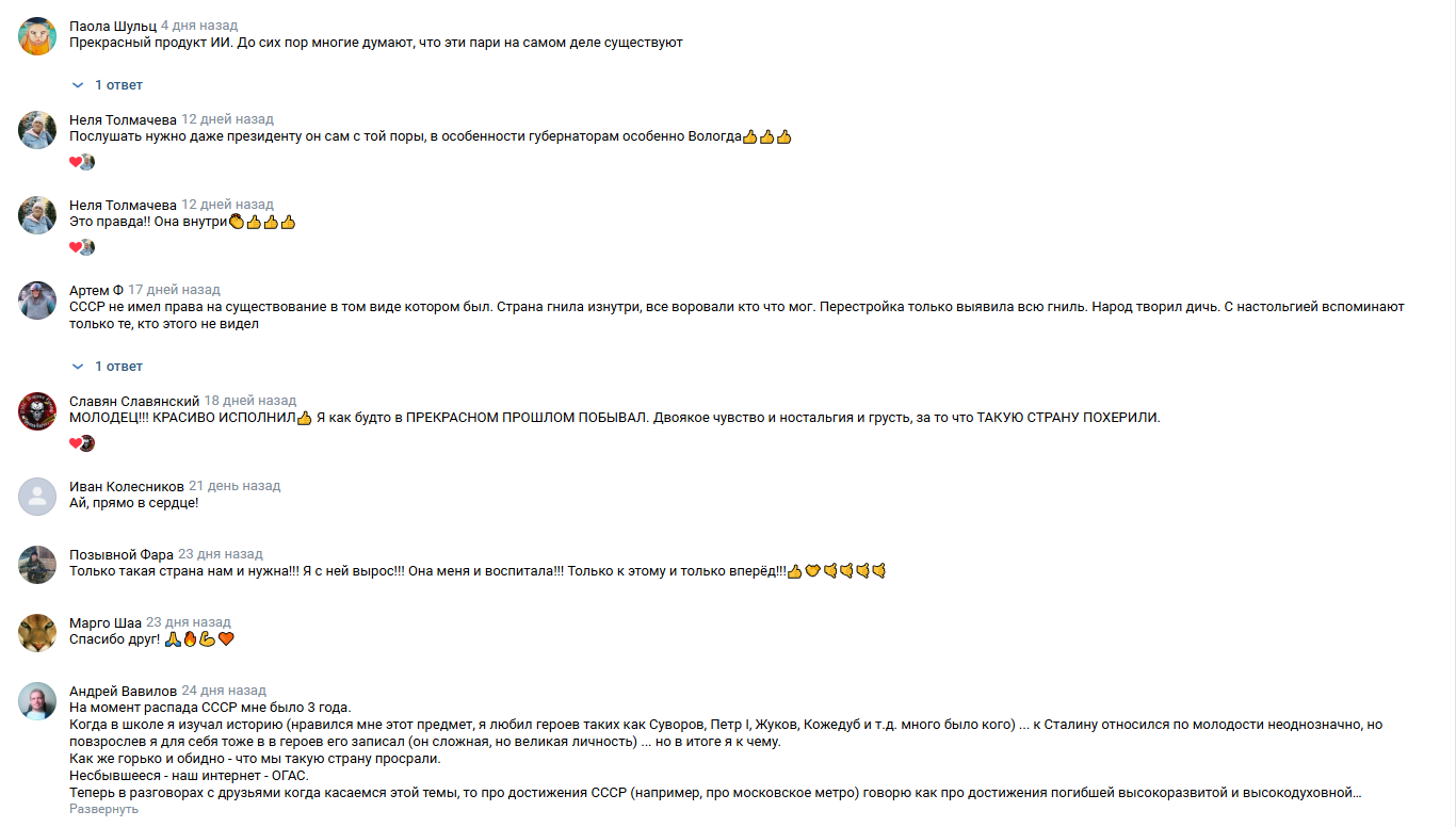 Вот ещё одна популярная нейросетевая песня — про Советский Союз (ссылка). Там уже робот не только поёт, но и показывает сгенерированные пафосные видеоотрезки. Из текста: «Люди хоть бедно, но весело жили, была уверенность в завтрашнем дне». Ну и дальше как в меме про «пенопласт из молочной пены», только всерьёз: «Соседи как родственники» и тому подобное.
