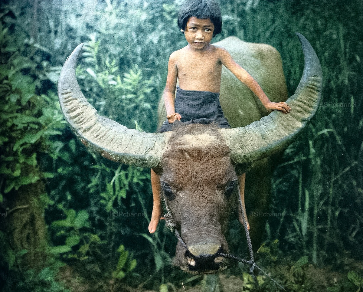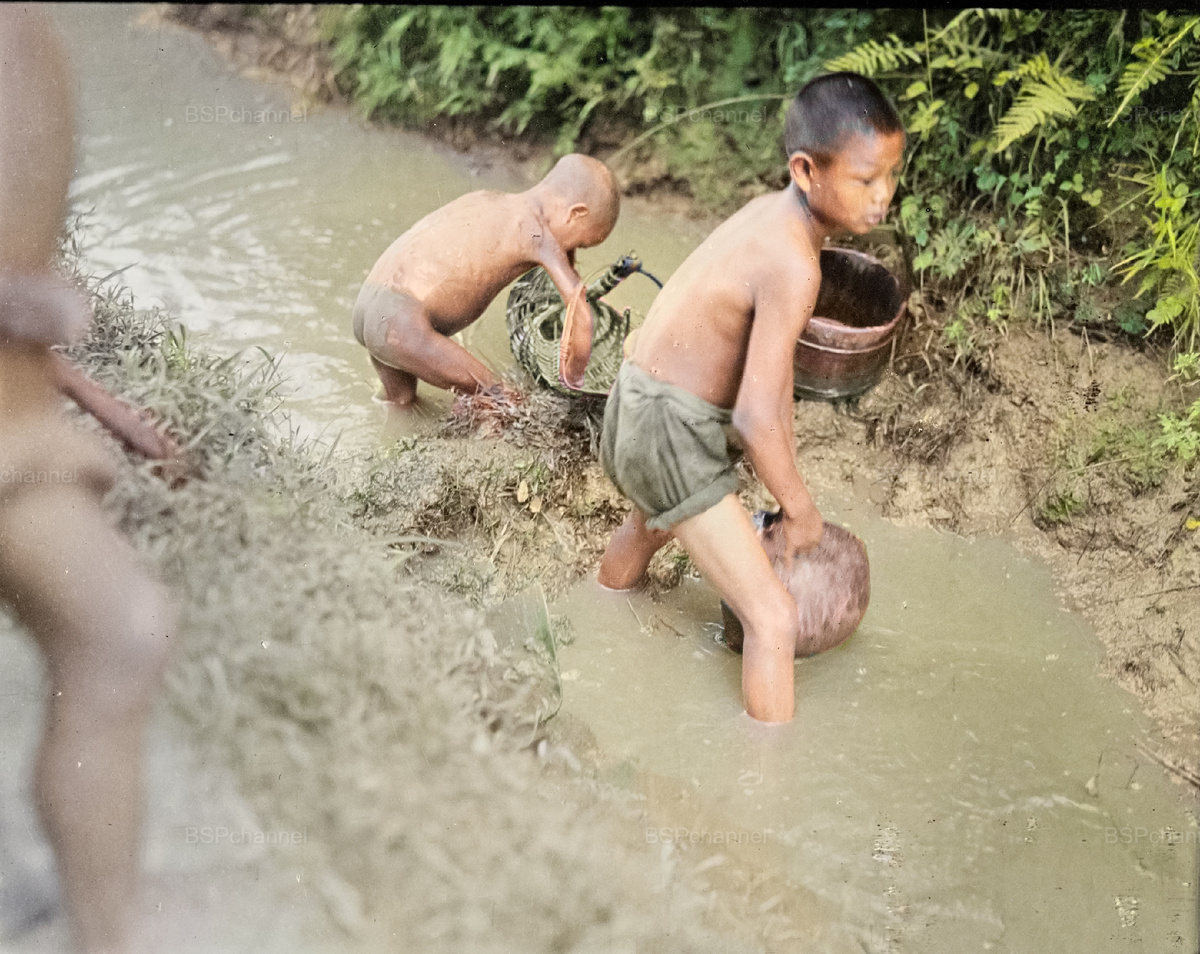 Мальчики занимались традиционной ручной ловлей рыбы в небольших речках и ручьях. Без сетей, без удочек — только сноровка, терпение и простые подручные средства: корзины, ловушки или даже голые руки. Такие сцены были неотъемлемой частью сельской жизни: дети с ранних лет участвовали в обеспечении семьи, а рыбалка становилась одновременно и трудом, и игрой.