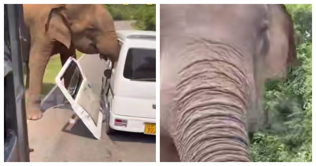 Группа туристов остановилась, чтобы покормить слона-попрошайку. Животному, похоже, не понравилось угощение или его размер. Слон выдрал дверь машины и начал шатать автомобиль.