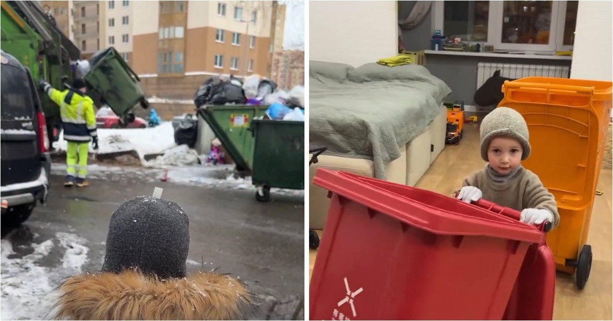 Маленькому мальчику так нравилось наблюдать за работой коммунальных служб: как вывозят мусор и перетаскивают баки, что он попросил маму купить ему свой собственный мусорный бак. Теперь дома он с удовольствием играет, изображая сотрудника мусорной компании, и увлечённо повторяет все рабочие действия.