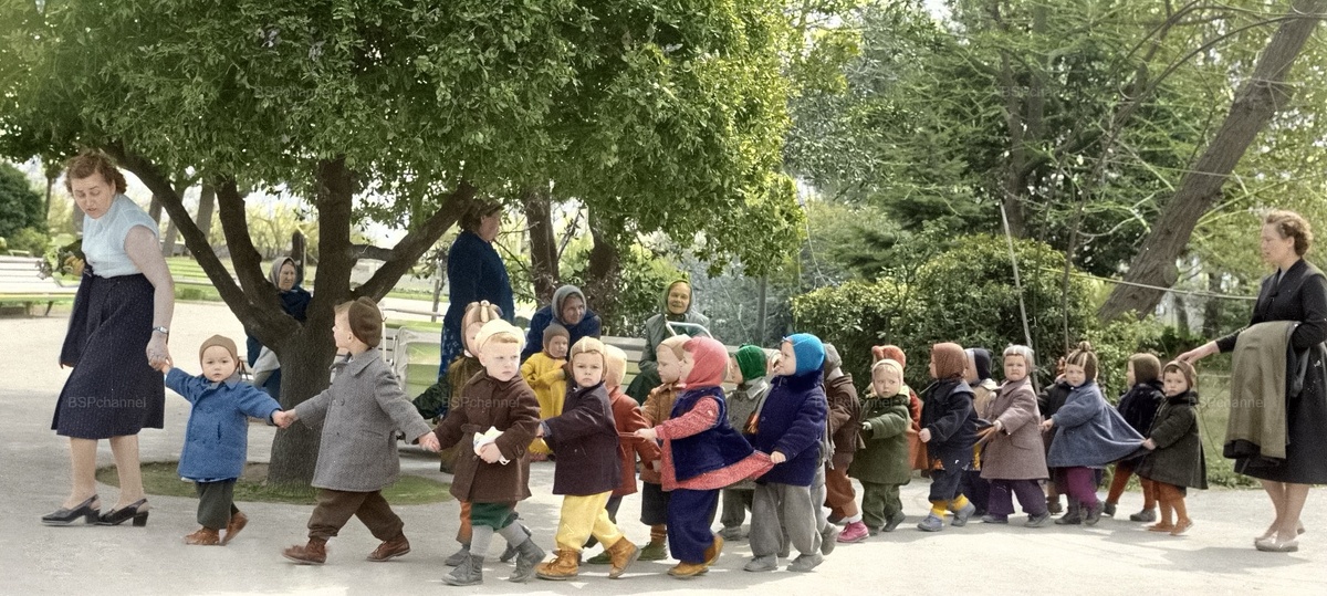Воспитатели ведут группу детей в парке. Крым, Ялта, 1960 год.