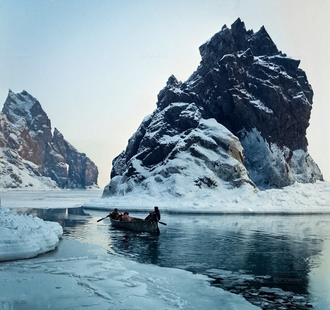 Эскимосы из села Сиреники выходят в море на байдаре обшитой шкурами моржей. Чукотский автономный округ, 1968 год.