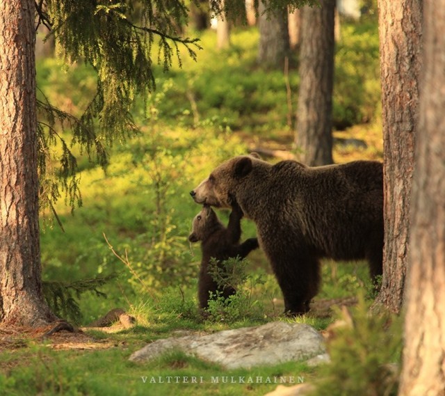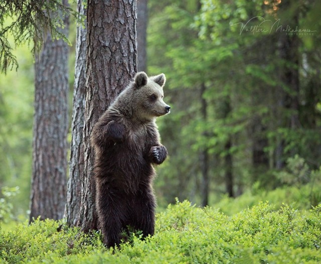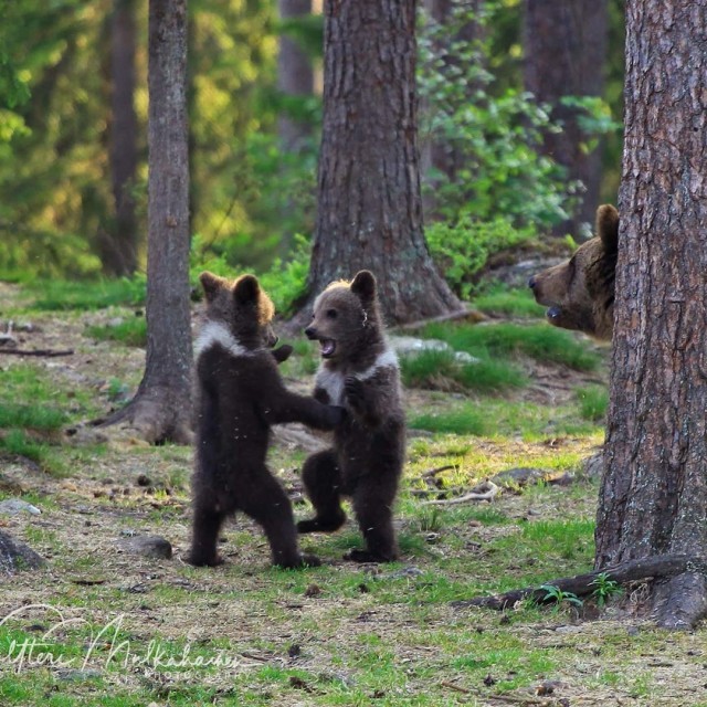 Валттери Мулкахайнен (Valtteri Mulkahainen) – учитель физкультуры из Соткамо, Финляндия, а ещё – фотограф дикой природы. Его фотоохота проходит в таёжных лесах, где можно из укрытия вести терпеливое наблюдение за бурыми медведями. Иногда удача улыбается, и снимки получаются по-настоящему удивительные. Однажды перед фотографом оказались трое медвежат, которые стояли на задних лапах и, будто, водили хоровод.