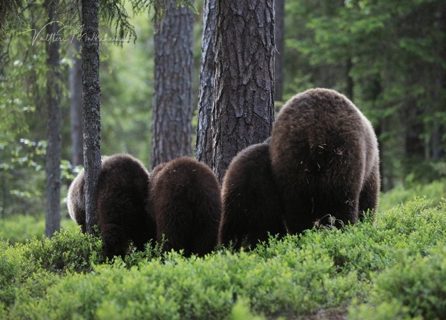 «Детёныши вели себя как маленькие дети. Они играли и даже по-дружески боролись. Я чувствовал себя как на детской площадке перед своим домом, где резвится детвора. В какой-то момент трое из них встали на задние лапы и начали толкать друг друга. Как будто они танцевали в кругу. Я фотографировал детёнышей с медведицей весь вечер и всю ночь рассказал», – Мулкахайнен. Он находился в укрытии в 50 метрах от действа и имел прекрасный обзор.