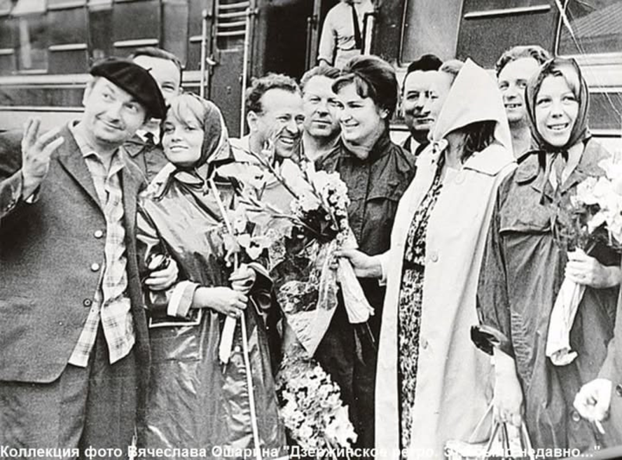 На гастролях: Георгий Вицин, Наталья Кустинская, Валентин Зубков, Борис Сичкин, Изольда Извицкая, Нонна Мордюкова, Николай Кузнецов, Тамара Носова.