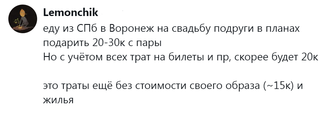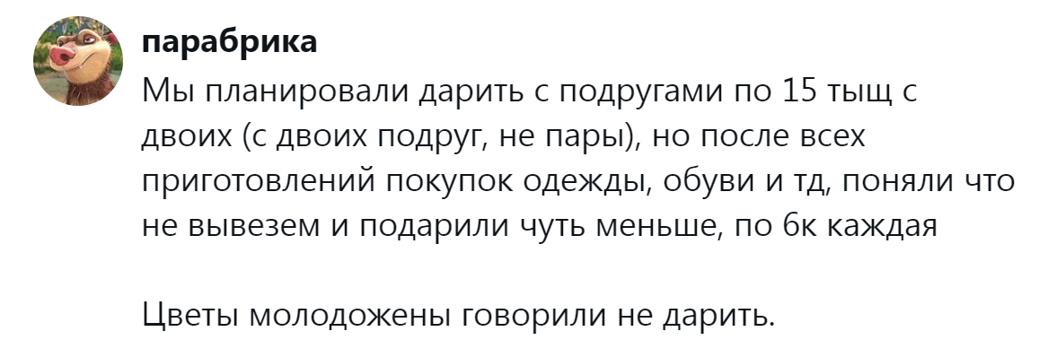 Но при походе на бракосочетание гости, избавленные от необходимости тащить бессмысленные пледы и ненужные сервизы, мучаются другим вопросом: сколько подарить молодожёнам, чтобы не прослыть жадиной, но и не остаться без копейки после чужого торжества? Пользователи обсудили этот животрепещущий вопрос, дали топикстартеру дельные, не очень и весьма неожиданные и неоднозначные советы.