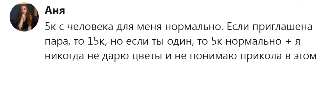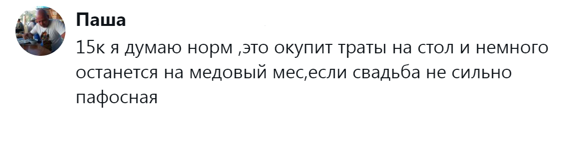 Как думаете, нужно ли обязательно исходить при выборе подарочной суммы из необходимости окупить расходы и оставить молодожёнам немного на медовый месяц? Или пусть радуются, что к ним вообще пришли на свадьбу, а если средств мало, то лучше ограничиться регистрацией и фотосессией без ресторанов и пышных гуляний?