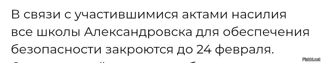 В связи с участившимися актами насилия все школы Александровска для обеспечения безопасности закроются до 24 февраля. Следственный комитет возбудил уголовные дела о покушении на убийство несовершеннолетнего, халатности и оказании услуг, не отвечающих требованиям безопасности.