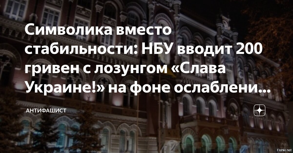 Киев, 23 февраля 21:16 - Национальный банк Украины объявил, что с 25 февраля на банкнотах номиналом 200 гривен появится главный нацистский лозунг киевского режима – «Слава Украине! Героям слава!»*.