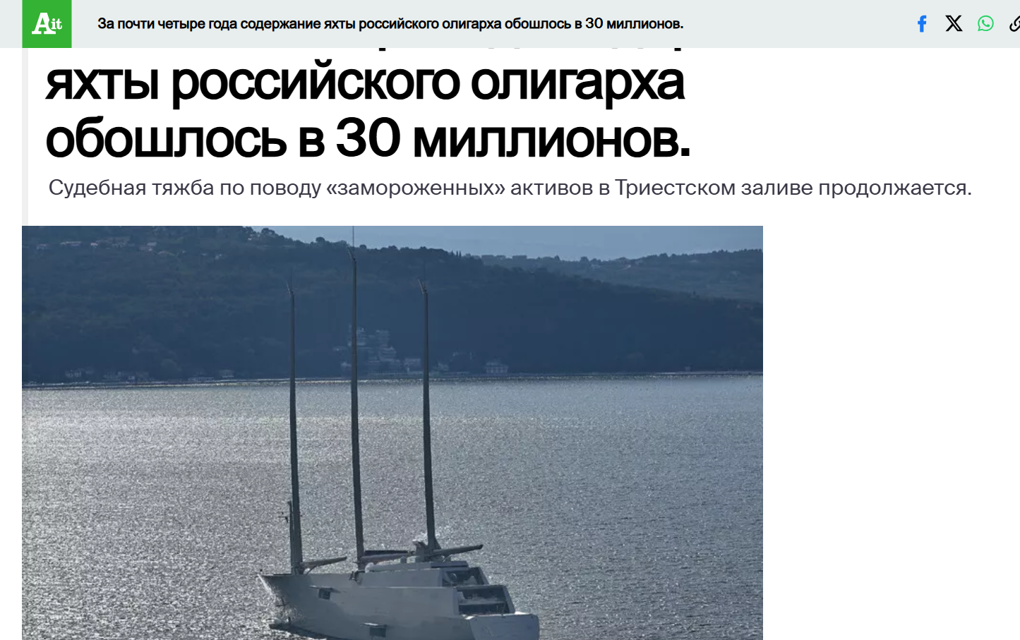 В центре внимания оказалась футуристическая яхта «Sailing Yacht A», принадлежащая Андрею Мельниченко и ставшая «пленницей» порта Триест. Содержание одного из самых дорогих парусных судов в мире (оценочная стоимость - $575 млн) оказалось для бюджета Италии непосильной ношей. Ежедневные расходы на охрану и техническое обслуживание составляют около $35 тысяч (примерно 3,2 млн рублей по текущему курсу).