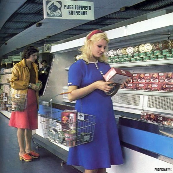 По многим признакам. Скажем так, это на похоже на спонтанную фотографию, вроде того, что кто-то случайно зашёл в магазин и сфотографировал. Тут видна композиция кадра. Чёткий ракурс перспективы, для чего снимок был сделан с использованием вышки или штатива на высоте 3-3,5 метра. Для обычной работы магазина в кадре очень малолюдно. На переднем плане стоят женщины, изображающие покупательниц. Они без сумок, корзинок и тележек в картинной позе стоят у прилавка и старательно изучают консервную банку в руках. Расстояние между ними строго выверенное, чтобы эти пять человек максимально заполняли собой пространство. При этом кроме них в зале магазина нет вообще никого, хотя пространство в кадре просматривается огромное. На заднем плане пусто.
