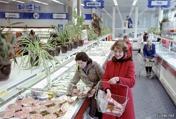 Вообще, это характерно для печатной продукции тех лет. Если посмотреть другие фотографии из этого сборника, то там всё то же самое. На них никаких очередей, полки заполненные товаром и улыбающиеся нарядные женщины как с рекламного проспекта. Впервые живые непостановочные фотографии в СССР стали массово публиковать в журнале "Смена" начиная с 1989 года. Это придало журналу изрядную популярность. Потому что разница живых фото с этими глянцевыми советскими картинками была разительной.