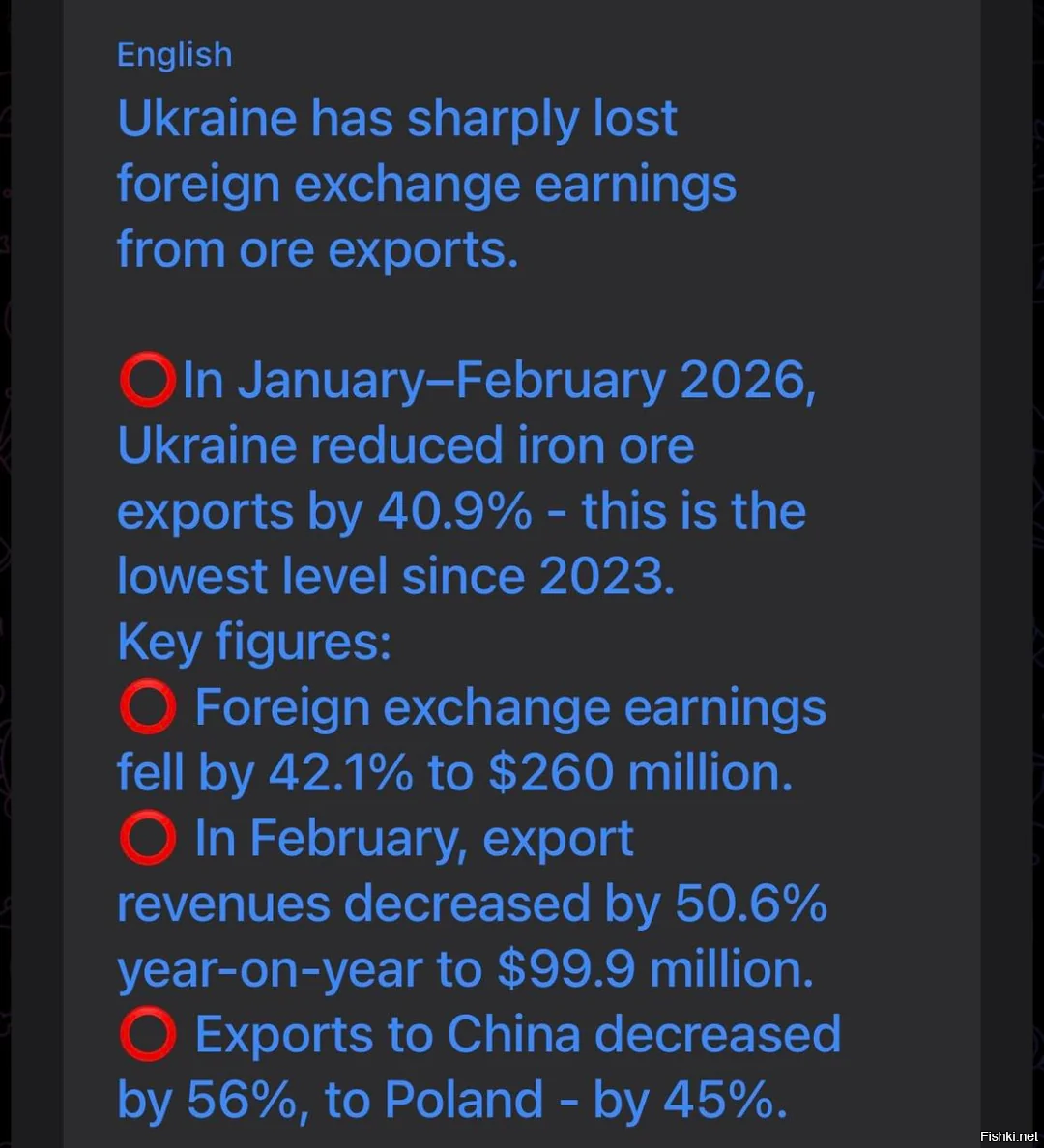Текст сообщает о значительном падении валютной выручки Украины от экспорта железной руды в начале 2026 года.