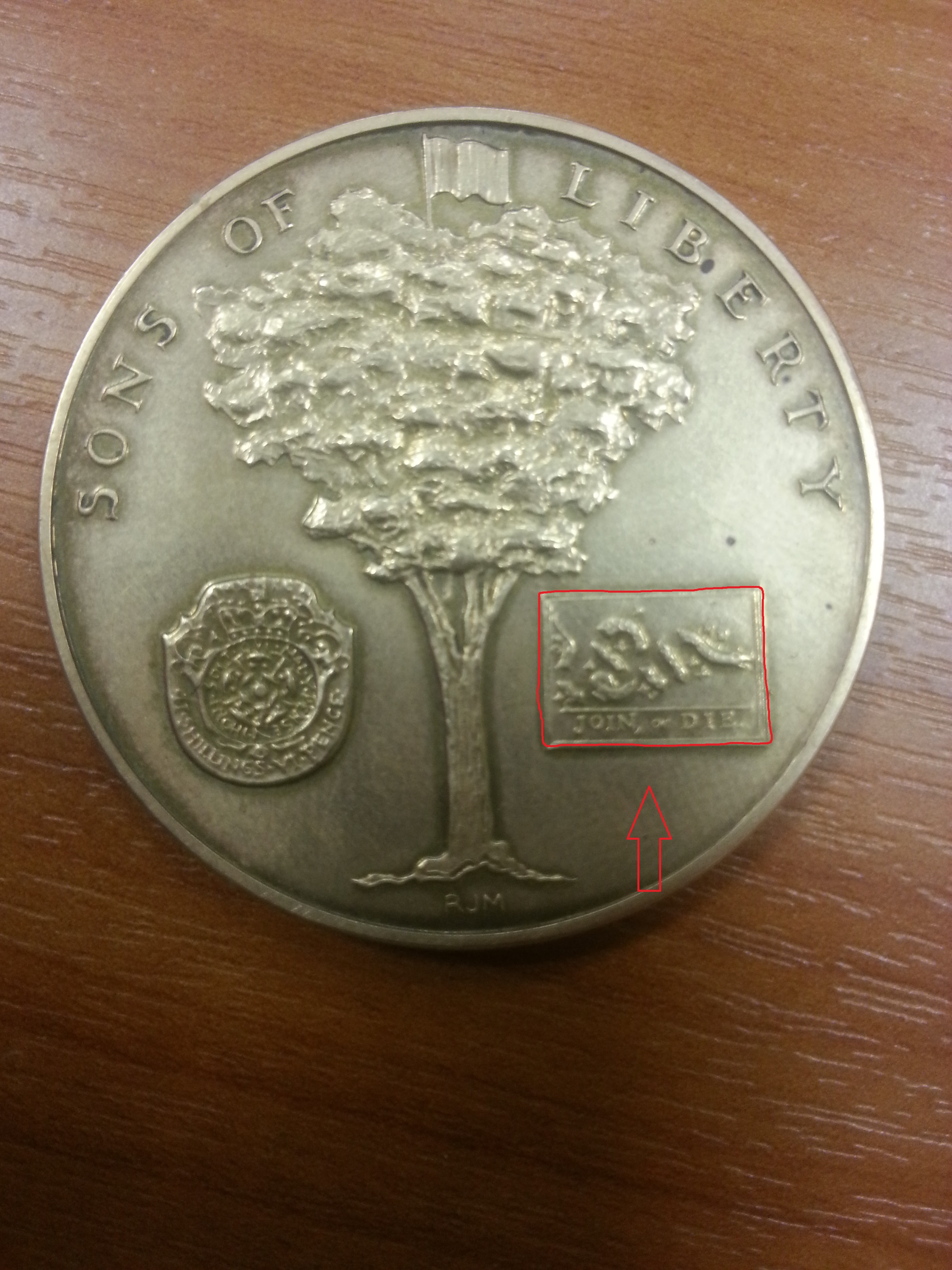 вторая сторона - дерево, либерти, все хорошо. Но лозунг в выделенной области ввел меня в легкое состояние шока... "join or die"? "Присоединяйся или умри"? Я верно перевел? Как по Вашему, в порядке вещей на гос. знаке размещать подобные призывы? Я понимаю, что монета приурочена к какому то памятному событию, но все же.. Демократия как ни как.
