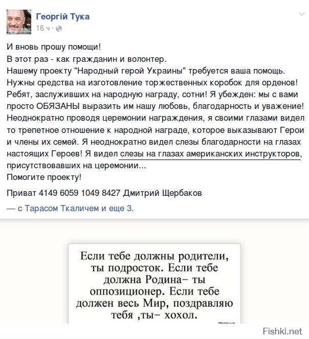 Волонтер и по совместительству гауляйтор оккупированной части ЛНР Георгий Тука призвал через FB скинуться на торжественные коробочки для орденов ради слез американских инструкторов. Вот ради чего майданутые уничтожают население Донбасса! Более циничного заявления я из уст свидомитов еще не слышал. Тука либо последний подонок, либо полный идиот. Скорее всего и то и другое.