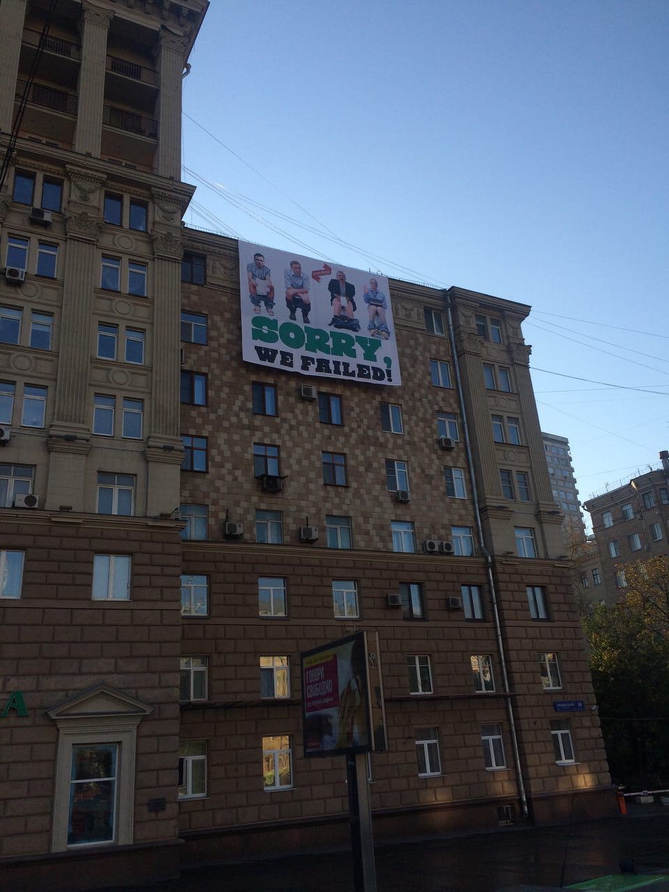 Второй плакат размещен напротив посольства США: «SORRY, WE FAILED!»