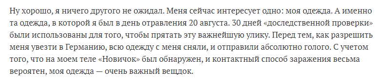 Факты говорят сами за себя – вещество было на бутылке, осталось только завести дело, найти причастных и засудить негодяев. Но тут в блоге Навального впервые появляется запись (не путать с Инстаграмом):