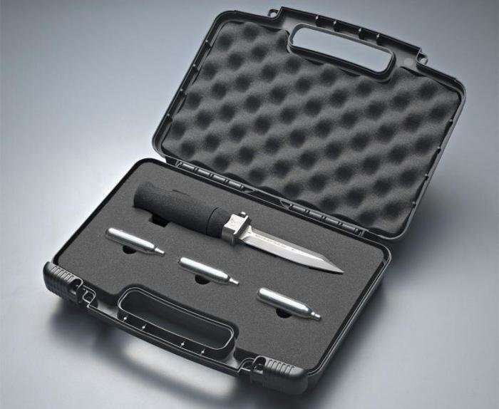 Оружие мгновенного действия: при нажатии кнопки нож выпускает в цель струю сжатого CO2. Разрывная сила изнутри способна остановить даже самого крупного зверя. Важно: это не оружие для людей, а крайнее средство самообороны в условиях дикой природы от крупных хищников.