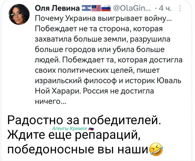 "Россия показала, что она не хочет мира, не хочет прекращения огня, не хочет ничего... Единственный способ остановить это – победить Россию с помощью военной силы, помочь Украине сделать это и оказать реальную помощь, которая необходима для этого."