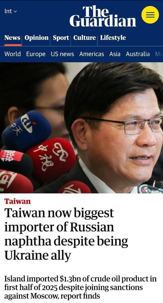 The Guardian сообщает, что в первой половине 2025 года Тайвань закупил у Москвы нефтепродуктов на $1,3 млрд — это на 44% больше, чем годом ранее.