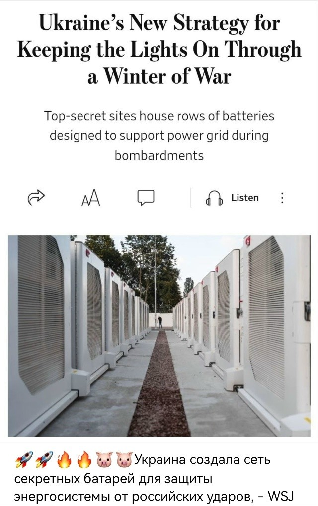 По данным издания, энергетики установили шесть мощных аккумуляторных парков американской разработки -в Киеве и Днепропетровской области. Их общая мощность - 200 МВт, чего достаточно, чтобы на два часа обеспечить светом около 600 тыс. домов.