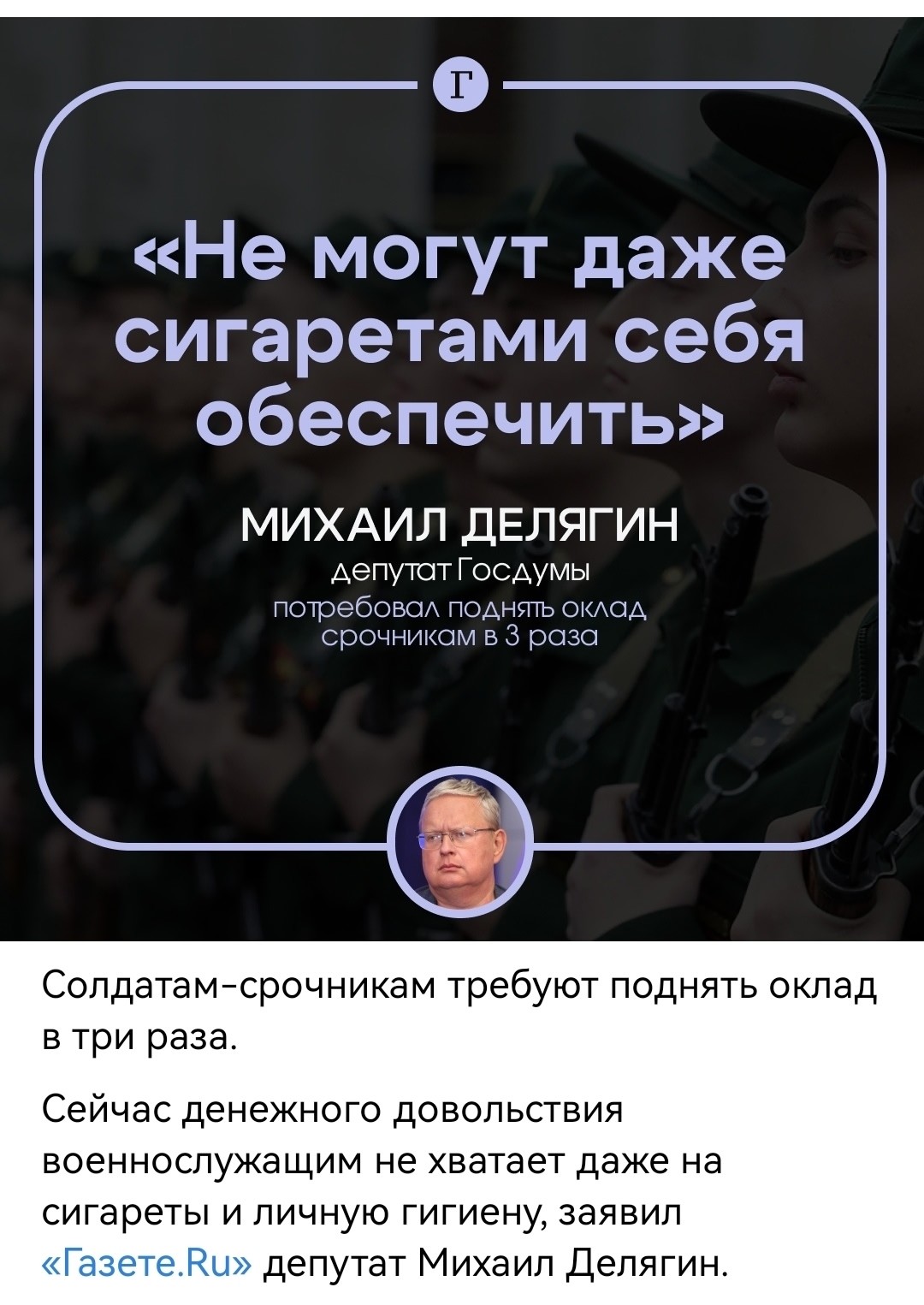 «Даже с учетом планируемой в этом году индексации оклад для солдат и сержантов на срочной службе составит 2492 руб. Этого явно недостаточно с учетом современных потребительских цен», — возмутился он.