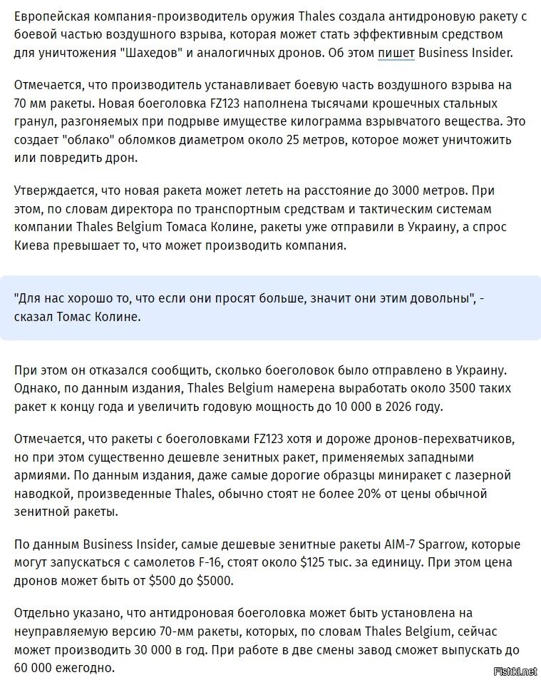 Современной войне нужны дешёвые в эксплуатации зенитные системы сверхмалого радиуса действия (до 10км). Такие в теории производят в США (ну по крайней мере рекламируют, но о боевом применении не слышал), точно производят в Швеции и Германии (фины и ЮАР даже закупаются такими в Швеции, а Польша и Венгрия закупают в Германии), скорее всего есть к КНР (оба сложных элемента таких систем они точно производят, объединить их плёвое дело), такие есть и у нас, даже заглянули на СВО, но пока что у наших беда с необходимыми боеприпасами (их тупо почти нет, производятся штучно, хоть в Китае закупай, благо их у Китая есть в достатке).