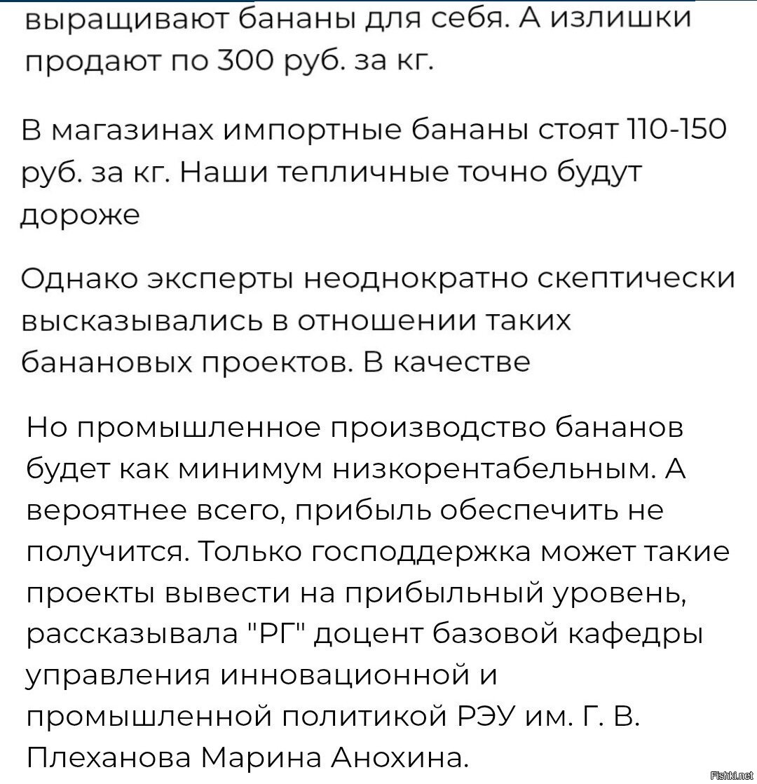 Но промышленное производство бананов будет как минимум низкорентабельным. А вероятнее всего, прибыль обеспечить не получится. Только господдержка может такие проекты вывести на прибыльный уровень, рассказывала "РГ" доцент базовой кафедры управления инновационной и промышленной политикой РЭУ им. Г. В. Плеханова Марина Анохина.