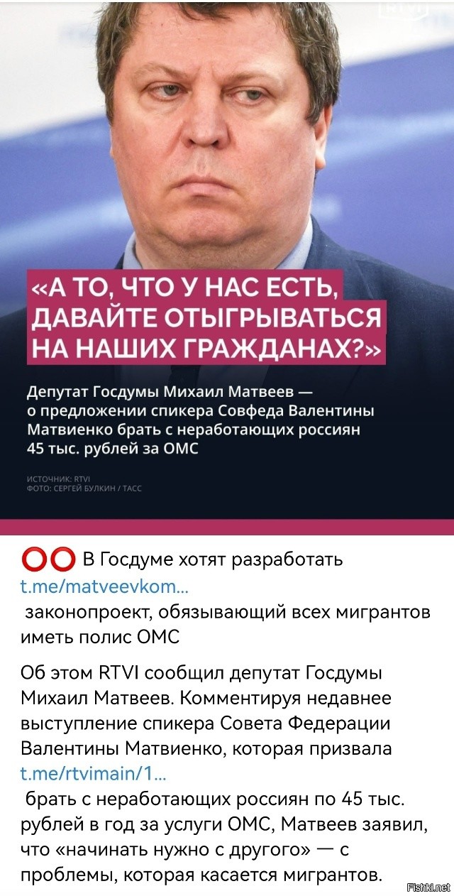 По словам Матвеева, из-за безвизового режима с отдельными государствами в страну «въезжает огромное количество членов семей тех людей, которые официально не работают». По его словам, ключевая проблема состоит в том, что при въезде в Россию мигранты не предъявляют полис ОМС, а должны его купить потом