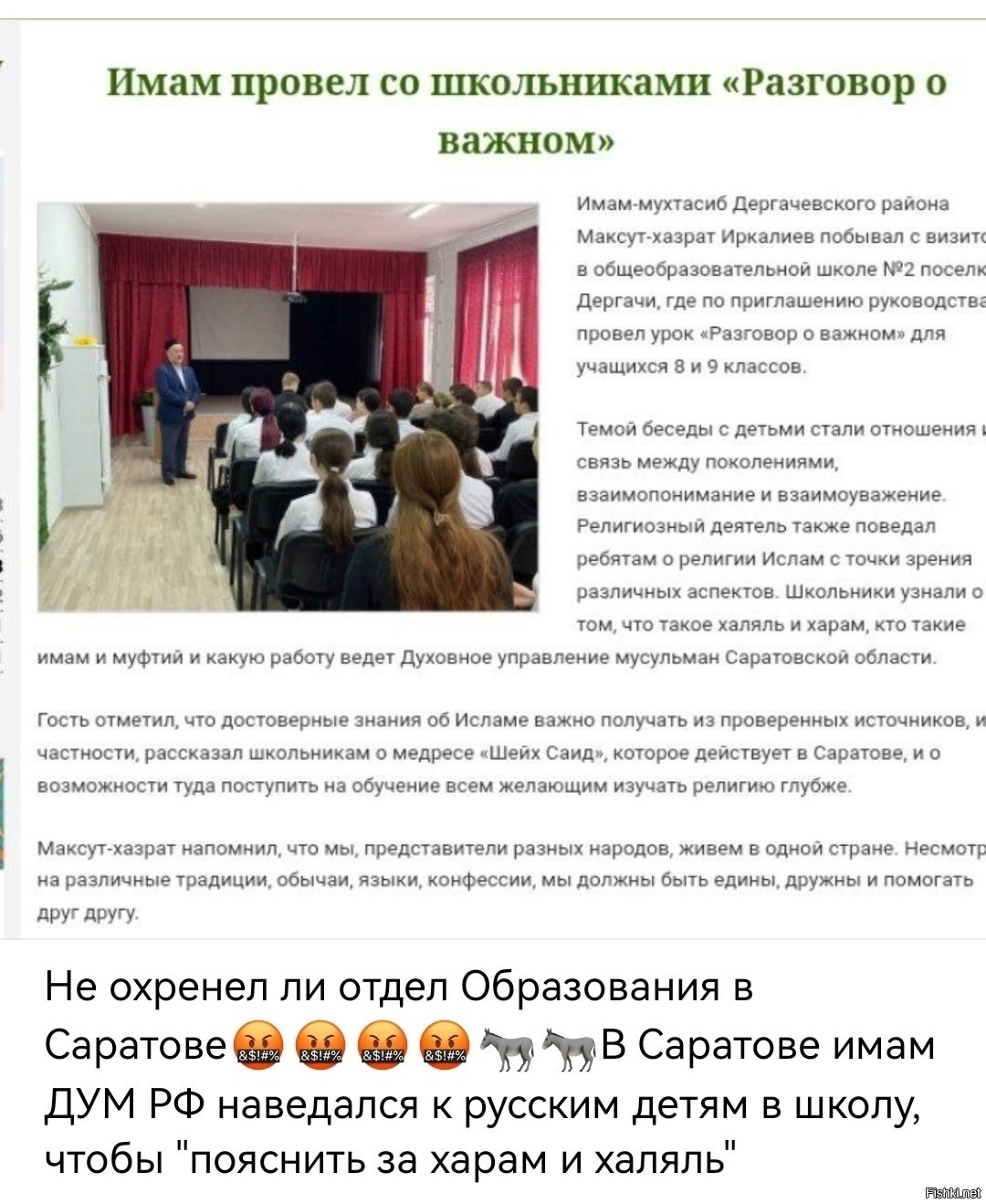 Школьники узнали о том, что такое халяль и харам, каких животных есть можно, а каких нельзя, кто такие имам и муфтий и какую работу ведет ДУМ Саратовской области. Он отметил, что знания об исламе должны получать все русские дети, и, в частности, рассказал школьникам о медресе «Шейх Саид», которое действует в Саратове, и о возможности туда поступить на обучение.