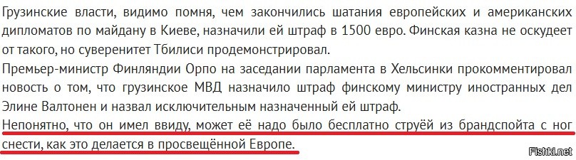Грузинские власти, видимо помня, чем закончились шатания европейских и американских дипломатов по майдану в Киеве, назначили ей штраф в 1500 евро. Финская казна не оскудеет от такого, но суверенитет Тбилиси продемонстрировал.