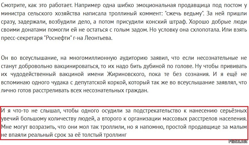 Смотрите, как это работает. Например одна шибко эмоциональная продавщица под постом у министра сельского хозяйства написала троллиный коммент: "сжечь ведьму". За ней пришли сразу, задержали, возбудили дело, а потом присудили конский штраф. Хорошо добрые люди своими донатами помогли ей не остаться с голым задом. Но условку она схлопотала. Или взять пресс-секретаря "Роснефти" г-на Леонтьева.
