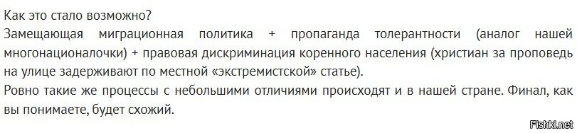 Замещающая миграционная политика + пропаганда толерантности (аналог нашей многонационалочки) + правовая дискриминация коренного населения (христиан за проповедь на улице задерживают по местной «экстремистской» статье).