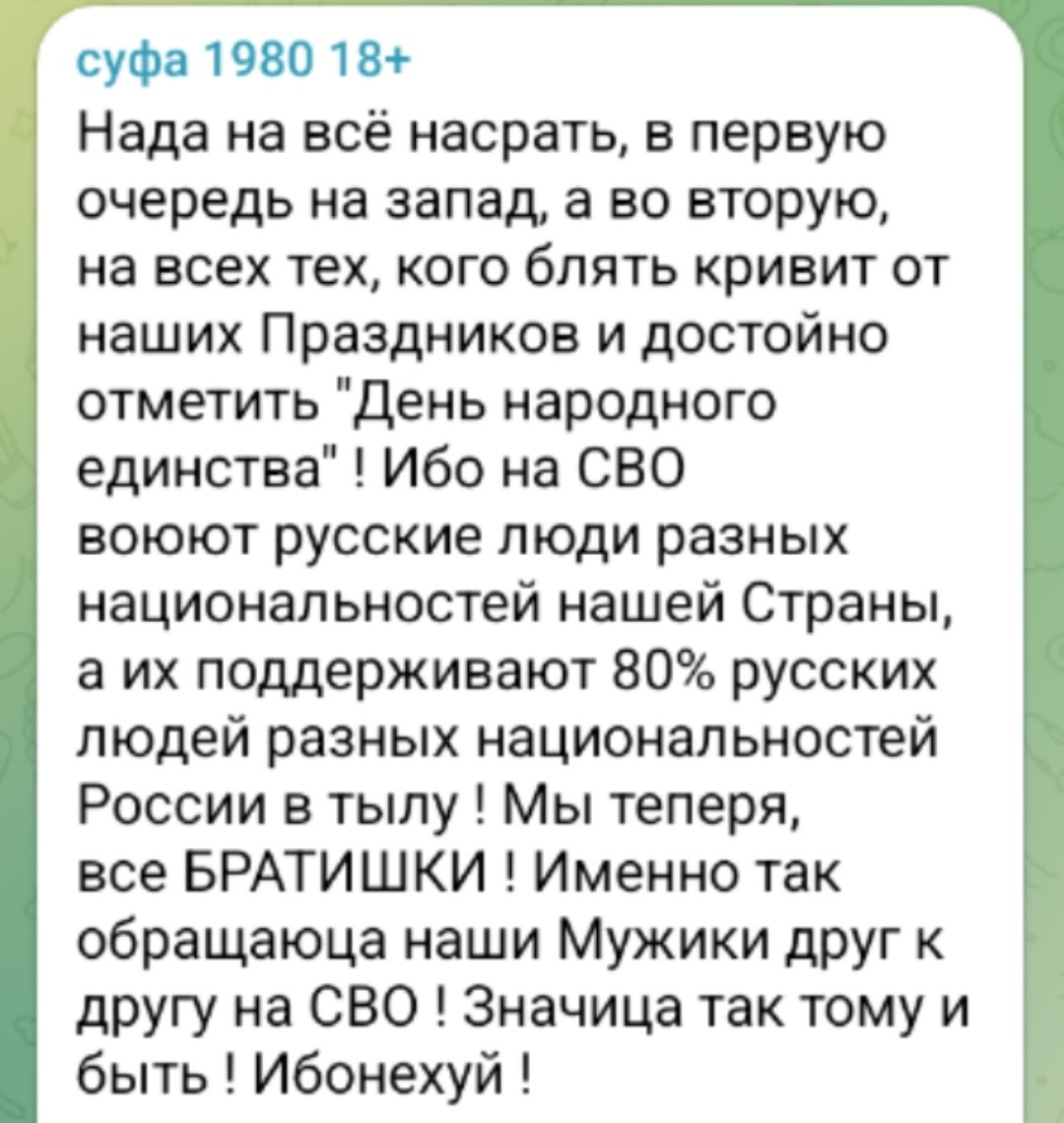 Причём, этническая преступность и криминальные случаи с мигрантами тут работают врагам России только на руку. Это всё реально не нравится многим жителям России. Мне в том числе! И, вот, такие настроения используют для раскручивания. Многие из фишкян используются фактически в тёмную. Т. е. они не получают оплаты за свои комментарии или публикации. Они, просто, следуют волне, лья воду на мельницу, которую построили и запустили извне. Так называемые, "полезные дураки". Это печально.