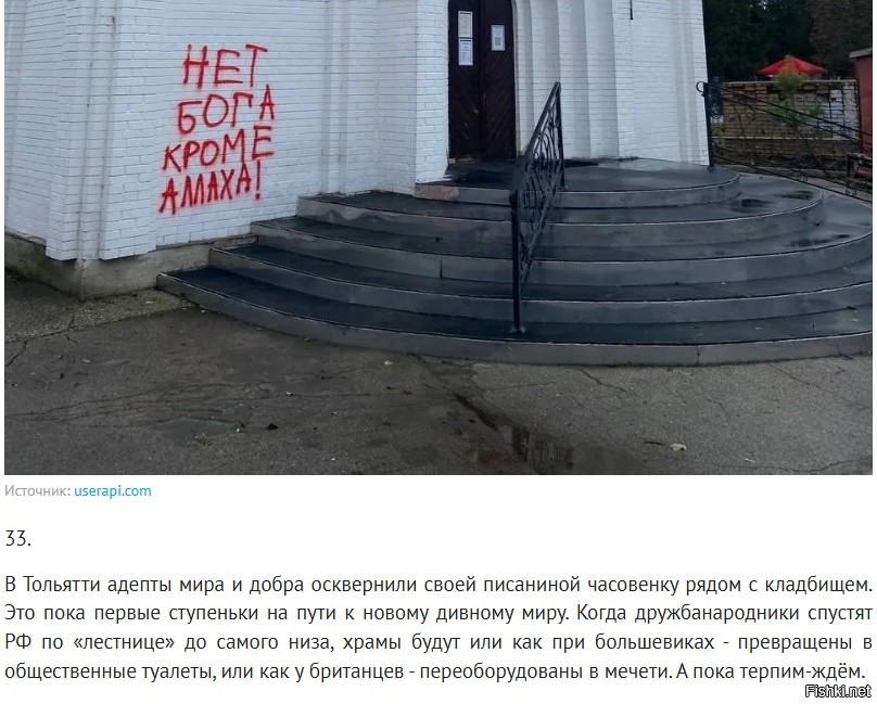 В Тольятти адепты мира и добра осквернили своей писаниной часовенку рядом с кладбищем. Это пока первые ступеньки на пути к новому дивному миру. Когда дружбанародники спустят РФ по «лестнице» до самого низа, храмы будут или как при большевиках - превращены в общественные туалеты, или как у британцев - переоборудованы в мечети. А пока терпим-ждём.