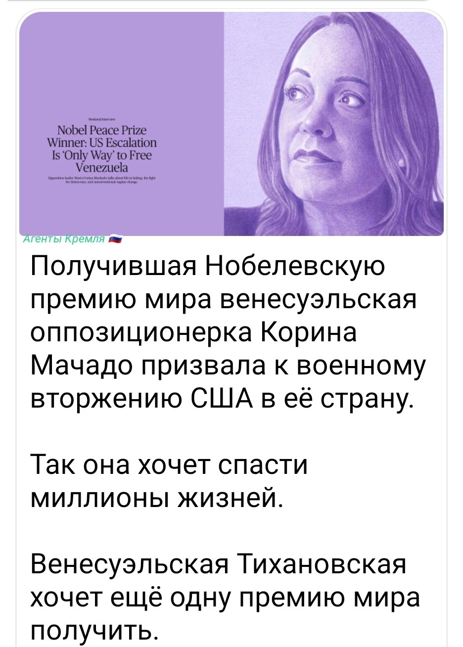 Действующий лауреат Нобелевской премии мира требует нанести удары по своей Венесуэле. Оруэлл аплодирует стоя