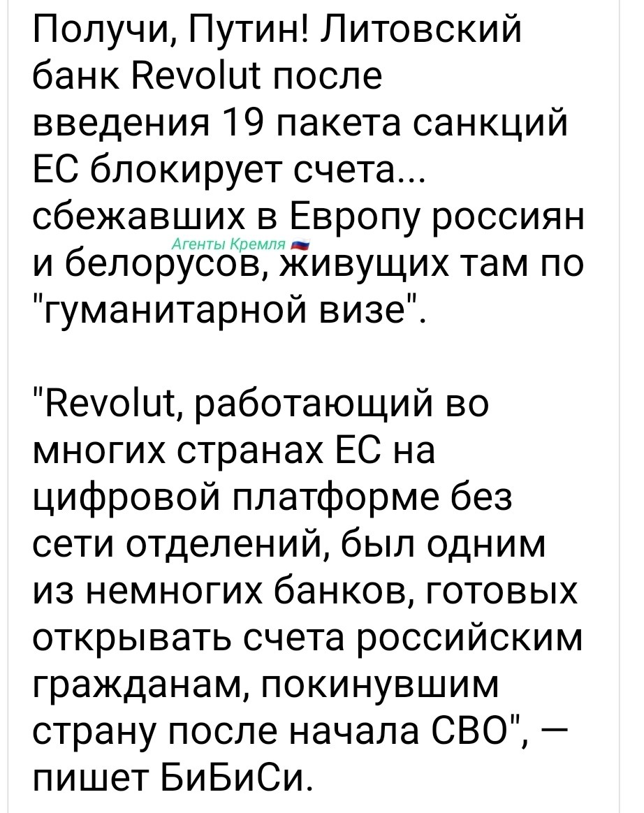"В интерпретации Revolut, 19-й пакет санкций ЕС запрещает оказывать платежные услуги или услуги электронных денег российским и белорусским гражданам, не имеющим действующего постоянного вида на жительства в странах ЕС, Исландии, Норвегии, Лихтенштейне или Швейцарии, либо гражданства этих стран".