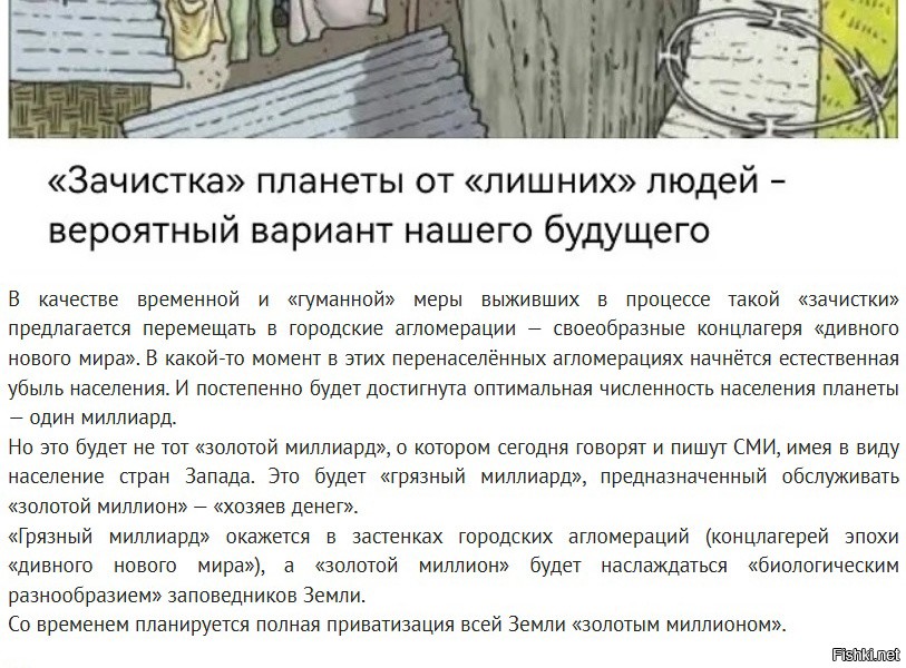 «Грязный миллиард» окажется в застенках городских агломераций (концлагерей эпохи «дивного нового мира»), а «золотой миллион» будет наслаждаться «биологическим разнообразием» заповедников Земли.