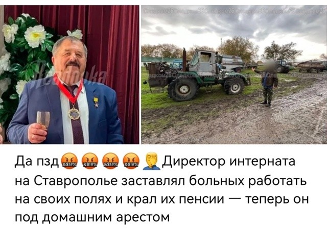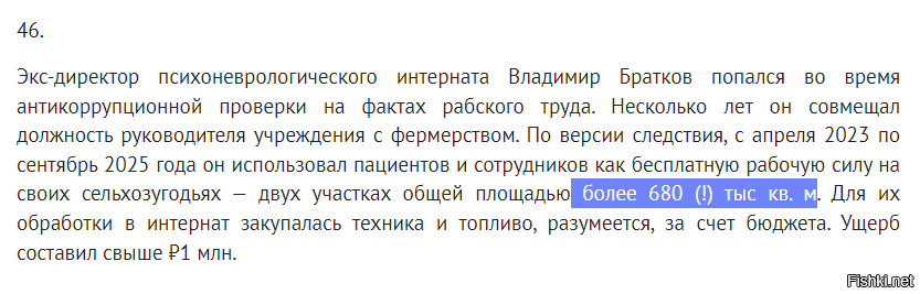 Экс-директор психоневрологического интерната Владимир Братков попался во время антикоррупционной проверки на фактах рабского труда. Несколько лет он совмещал должность руководителя учреждения с фермерством. По версии следствия, с апреля 2023 по сентябрь 2025 года он использовал пациентов и сотрудников как бесплатную рабочую силу на своих сельхозугодьях — двух участках общей площадью более 680 (!) тыс кв. м. Для их обработки в интернат закупалась техника и топливо, разумеется, за счет бюджета. Ущерб составил свыше ₽1 млн.
