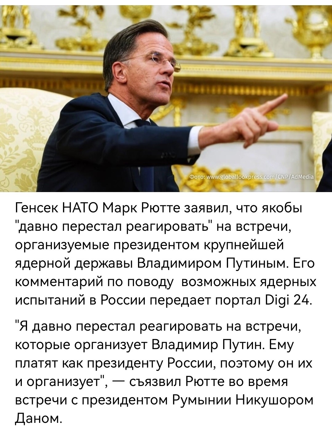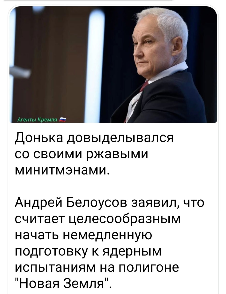 Накануне в ходе совещания с членами Совбеза министр обороны РФ Андрей Белоусов заявил, что считает целесообразным начать немедленную подготовку к полномасштабным ядерным испытаниям. Путин также отметил, что Россия предпримет соответствующие действия, если участники договора решат провести ядерные испытания.