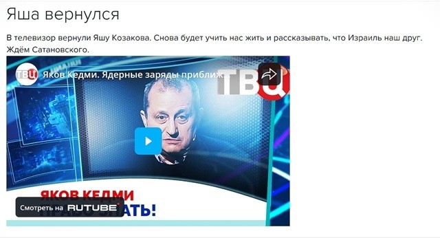 Но речь не об том, Яша. Ви таки скажите нам, а на из'гаильских ток-шоу есть ли какой-нибудь русский, шоб также учил Из'гаиль жить п'гавильно? Нет, я таки понимаю, шо здесь таких полный Склад, и вам, я скажу как по секрету, вам таки стоило бы их послушать... Но шоб вот прямо на из'гаильском телевидении в прайм-тайм, скажите, учит ли вас жить какой-нибуть гой?